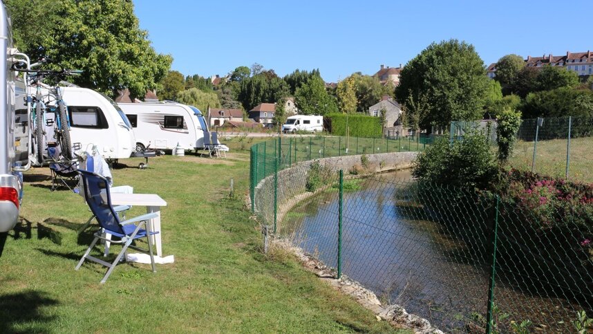 The location of this site is really quite spectacular, lying in the shadow of the Château of William the Conqueror, within walking distance of the historic town of Falaise in the heart of Normandy. The site itself is small, with only 60 pitches (most with 10A electricity) either beside the little river, on a terrace above or on gently sloping ground. There are plans for some new terracing which will provide more level pitches. With trees and hedges providing some shade as well as open grassed areas, this site has a pleasant, rather intimate feel about it. Charges are reasonable and the reception friendly.