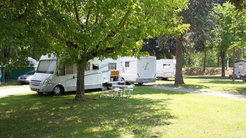 Camping du Foix, also known as Camping Du Lac is a traditional, urban lakeside site just 3 km. north of the very pretty town of Foix. There is some road and rail noise (the site is alongside the old N20). There is space to manoeuvre at the entrance. The site is informally divided into four areas, one for mobile homes. The other areas are generally flat or slightly sloping with some shade under mature trees. There are 45 pitches for touring most with electricity (8-13A). Access to the lake is through a gate which is locked at night and the fence is secure. Children will need supervision in this area.