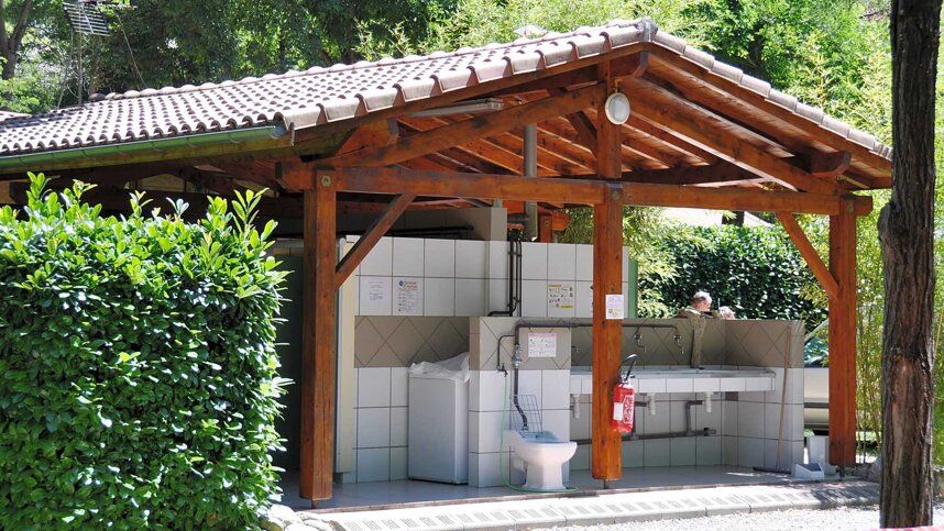 Two modern sanitary blocks are well equipped. One also has accessible facilities and a family shower room with a baby bath. Motorhome services. Cold drinks and ice-cream available in reception building in July/Aug. Bread, sandwiches (hot and cold) and pizzas (July/Aug). Good sized heated swimming pool. Small play area.