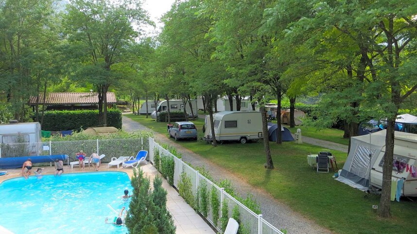 Situated in the small town of Mercus just 1 km. from the N20 between Foix and Andorra, this is a lovely campsite on the shores of a lake, devotedly run by Jacky and Martine Podvin. The site has 70 pitches (38 for touring and 22 chalets and mobile homes to rent). The grassy pitches are attractively laid out, level and partially shaded by mature trees. Each has electricity (6/10A; Europlug) adjacent and all are reasonably close to the modern sanitary blocks. There is some background road noise and also several trains run alongside the site throughout the day between 06.00-22.00.