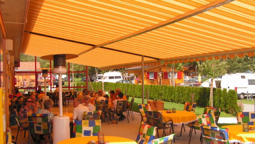 Heated toilet blocks with hot showers (charged), washbasins in cabins and accessible facilities. Washing machines and dryers. Motorhome services. Small shop, bar, restaurant and takeaway. Outdoor pool (mid June-Sept). Games room. Playground. Trampoline. Garden chess and draughts. Small lake. River adjacent. Ski storage. WiFi (charged).