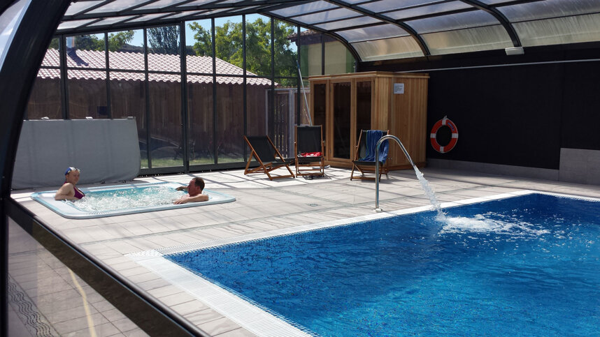 Clean, well-equipped toilet block with cold water to washbasins, Accessible facilities. Washing machine. A large restaurant with a pleasant bar. Supermarket. 2 swimming pools for adults and children (June-mid Sept), including an indoor heated pool with spa and another outside with slide (seasonal). Bicycle hire. Canoe/pedalo hire. Riverside bar. Weekly entertainment programme (July/Aug) and many sporting activities. Squash courts. Mini golf, Tennis, Football, Riverwalk. Torches useful. Wine-tasting tours can be arranged. Gas barbecues only. WiFi on the part of the site (charged). Pets allowed.