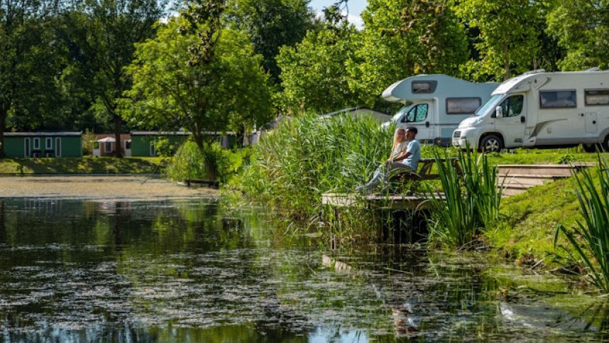 The site is well laid out alongside a canal, with open pitches on separate flat lawns, mostly backing onto pleasant hedges and trees, with several areas of paved hardstandings. It takes 400 touring units, with 100 electrical connections (10A) and some with cable TV. An additional area is available for tents and groups. Some pitches can become very wet in the rain. The site has a modern reception, the former restaurant is now a cooking and dining area, and there are modern cabins to rent.
