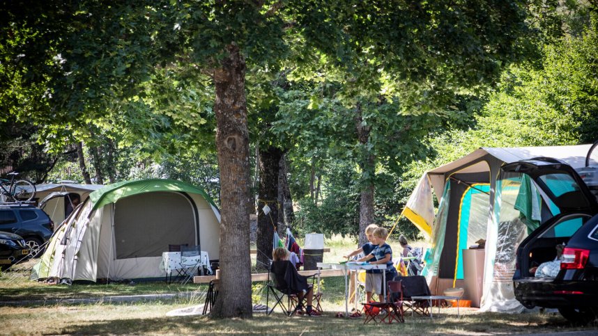 Huttopia Bourg-Saint-Maurice is on a small, level plain at an altitude of 830 m. on the River Isère, surrounded by mountains and attracts visitors all year round (except for a short time when they close). The site’s 153 unseparated, flat pitches (135 for touring) are marked by numbers on the tarmac roads and all have electrical connections (10A). Most are on grass but some are on tarmac hardstanding making them ideal for use by motorhomes or in winter. Trees give shade in most parts, although some pitches have almost none. Duckboards are provided for snow and wet weather. Formerly known as Camping le Versoyen, this is a good base for winter skiing, summer walking, climbing, rafting or canoeing, or for car excursions.