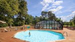 Reception is large and efficient, with English spoken. Facilities include two very good outdoor heated swimming pools, both 25x15 m. one deep, one shallow, and a small children’s pool (open about 7/5-7/9). Grass sunbathing areas extend down to the sandy surrounds of a lake used for boating and swimming. These are free to campers except for an initial fee for an identity pass. This is a dog-friendly site with walking opportunities in the adjacent national park.