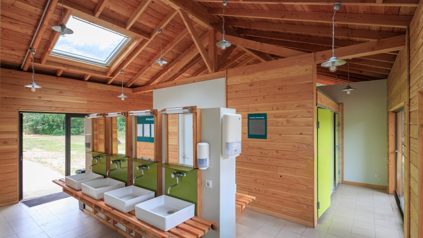 Four toilet blocks are clean and well maintained, and include individual washbasins with cold water, baby room and accessible facilities. Launderette. Supermarket. Restaurant/bar (high season). Takeaway (high season). Swimming pools (May-Oct). Organised sports programme (July/Aug. and school holidays). Fishing lake. Large playground on grass and sand, Bicycle hire. No charcoal barbecues. WiFi in reception area (Free).