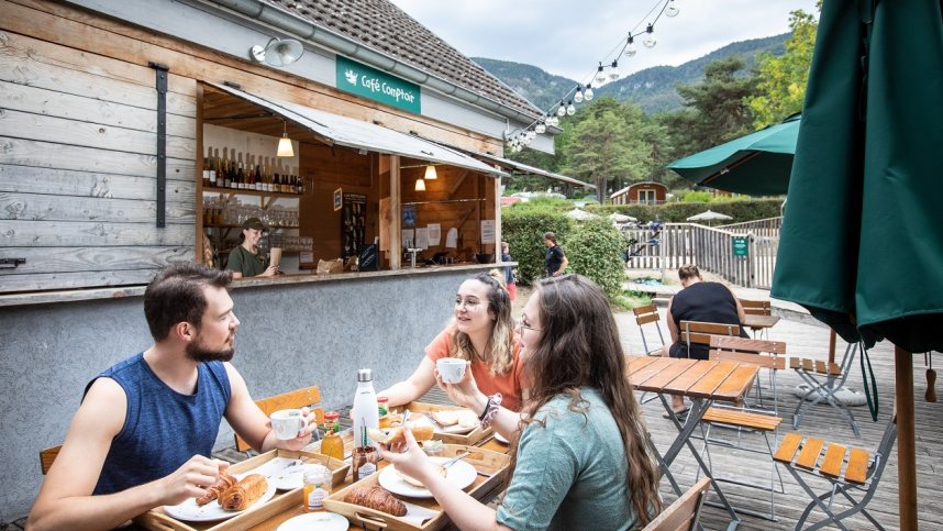 Huttopia Divonne Les Bains is situated in the Haut Jura National Park, close to the Swiss border. It is in a large natural area surrounded by mountains and open countryside, only 3 km. from the lakeside spa town of Divonne-les-Bains. There are many swimming and watersports areas on the lake as well as on the much larger Lake Geneva, which is only 9 km. away. The wooded, nine hectare, terraced site has 231 pitches of which 181 are for touring units. These vary in size greatly so offer something for backpackers, as well as those with large units. Drivers of motorhomes may find levelling an issue on some of the sloping pitches. Most pitches have 10A electricity, many have shade and some have views over the lake and magnificent Mont Blanc.