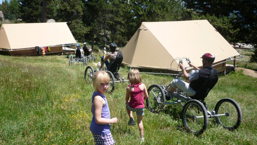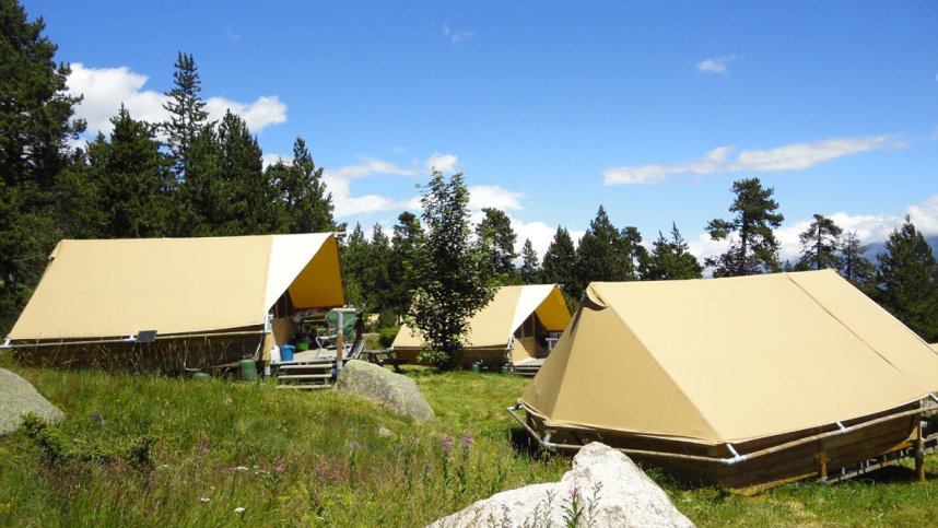 This is a large, open site of some seven hectares, with 164 pitches of which 123 are for touring, 72 pitches have 10A electric hook up points available. nestling on the side of the mountain at the entrance to Huttopia Font-Romeu. This part of the Pyrenees offers some staggering views and the famous Mont Louis is close by. An ideal base for climbing, hiking and cycling, it would also provide a good stopover for a night or so whilst travelling between Spain and France, or to and from Andorra. The terraced pitches are easily accessed, with those dedicated to caravans and motorhomes at the top of the site, whilst tents go on the lower slopes. Trees provide shade to many of the pitches from the sun which can be quite hot at this altitude.