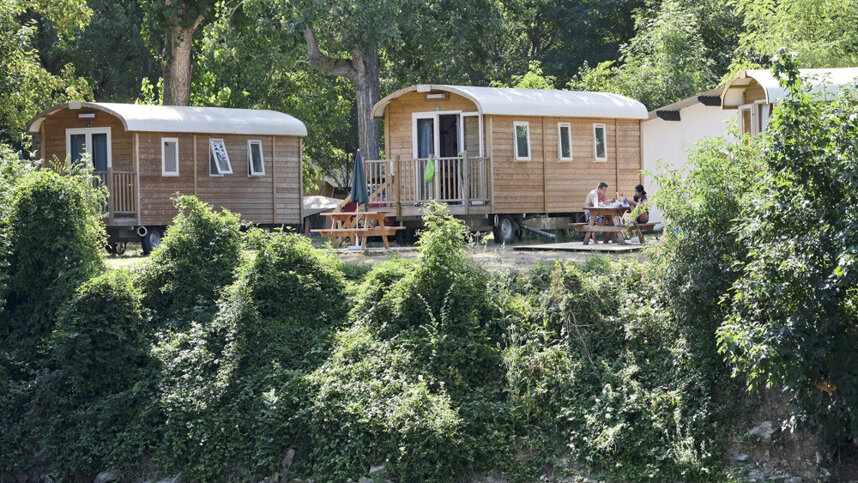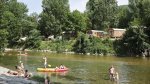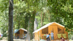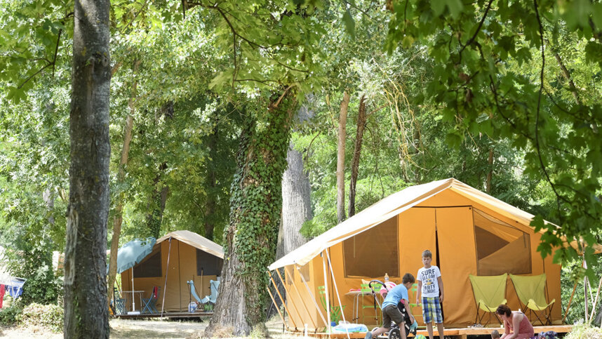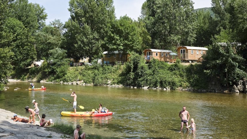 Huttopia Millau is just 500 m. from the lively market town of Millau which lies in the valley below the imposing Millau suspension bridge. There are 152 good sized, slightly sloping grassy pitches with varying degrees of shade, good views over the wooded hills and some enjoy a riverside location. There are 119 pitches for touring with 6/10A electricity for which long leads are needed. The site has a heated swimming pool and snack bar/bar, pleasant for unwinding after a busy day touring making it ideal for long or short stays. The site is situated at the confluence of the Dourbie and Tarn rivers making this a good spot for all the family to have fun in the clear shallow waters.