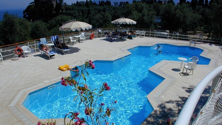 Set high above the sea, some pitches here have attractive views across the water. Access is via a very steep paved driveway with sharp bends. Pitches are mostly on hard ground with shade from olive trees and oleanders. There are cabins, caravans and apartments to rent scattered throughout the site. The reception, a bar, shop, pizzeria and restaurant share a busy centrally located building which overlooks the pool area. The pool, although quite small, is attractive with its irregular almost hexagon shapes and there is also a small jacuzzi.