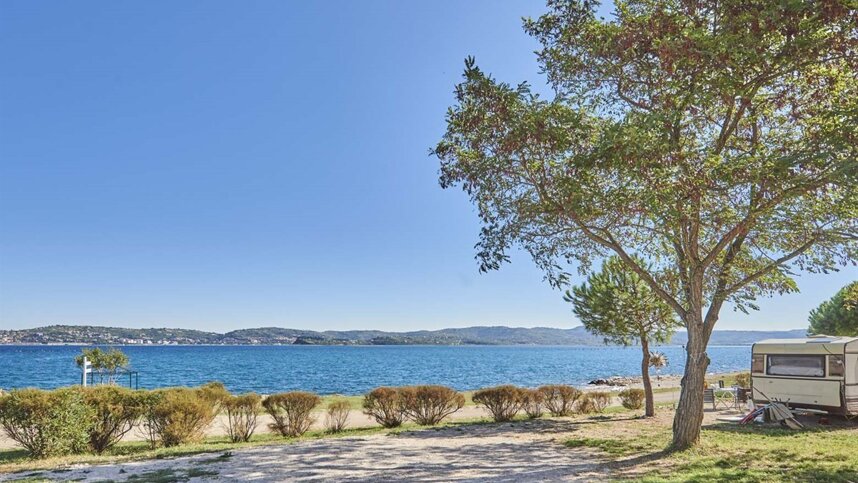There are 193 level pitches here on sandy soil with sparse grass (90 are seasonal). They vary in size (60-100 sq.m), are marked and numbered and all have 16A electricity, however some also have water and drainage. The site has an open aspect with very little shade and sparkling clear waters off the rocky beach which runs its total length.