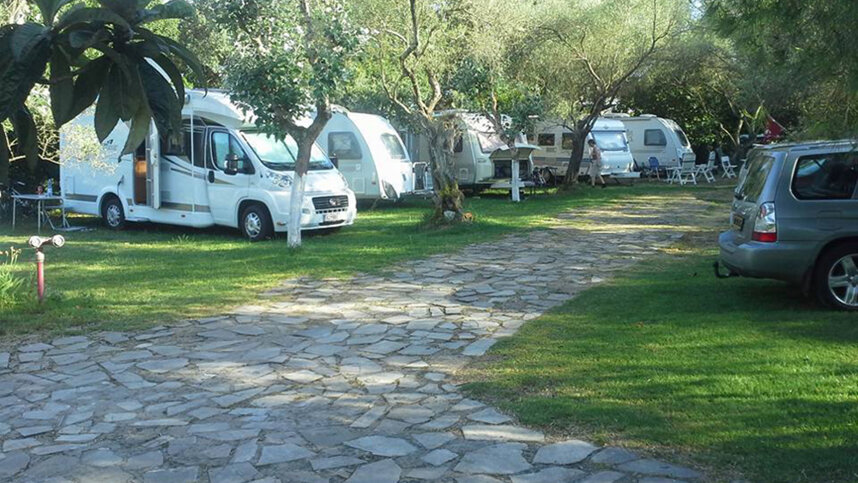 The island of Lefkada is one of the few Ionian islands that you can access without using a ferry. This campsite is 500 m. from the beach on the main road south (slight traffic noise). There are 75 pitches amongst tall olive trees, but only about 15 places are suitable for caravans or motorhomes.