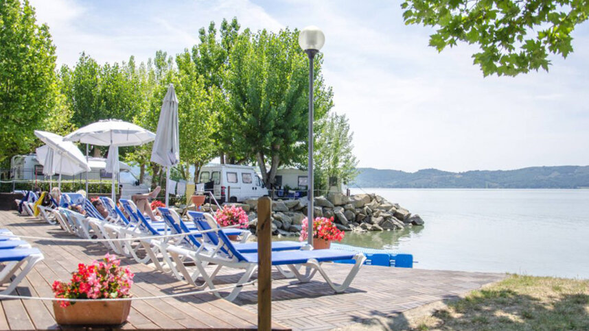 Opened in 1967, Camping Kursaal is the oldest campsite at Lago Trasimeno and sets a very high standard. Located directly beside the lake, it is a small site with 60 touring pitches. Attractively laid out under tall pines, all pitches have 4/6A electricity and shade from trees and large flowering shrubs. Superb views are enjoyed by the pitches on the lakeside itself whilst others have more limited lake views. The site is in the grounds of an attractive old villa which is now a good quality hotel. Camping visitors can use the hotel amenities including the bar, lounge and the excellent restaurant.