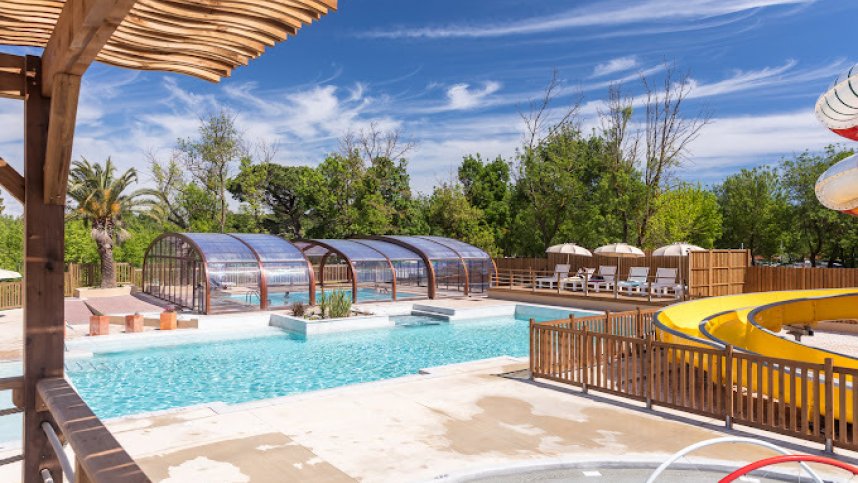 A shaded, neat and tidy haven just off the main square within easy walking distance of the beach. There is a super pool complex at the far end of the site including a heated pool with sliding cover for early and late seasons, a large outdoor pool and various other small pools with slides, and a jacuzzi. Most of the sandy, grass pitches are 100 sq. m. regularly laid out with 6A electricity with hedging and shade from tall trees. The site is under the same ownership as Les Criques de Porteils near Collioure, and is popular with tour operators.
