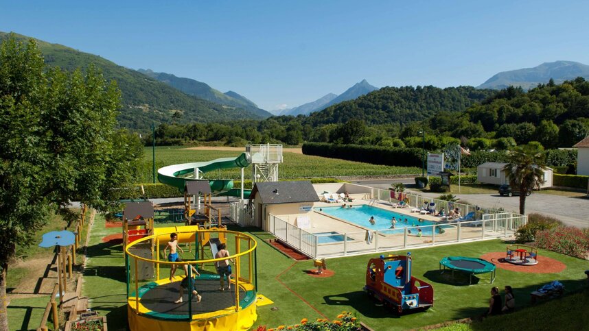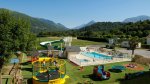Unwind and have a blast at the large aquatic area. Take a refreshing dip in the heated pool, let the little ones splash around in the paddling pool (depth: 0.45m), or enjoy going down the water slide—there's something for everyone! Soak up the breathtaking mountain views while relaxing on a sun lounger by the pool. Keep the kids entertained at the expansive playground featuring a variety of equipment on a safe, shock-absorbing surface. The playground includes slides, climbing structures, a bird's nest swing, and two trampolines. Challenge your friends and family to a game of boules (petanque) or table tennis, or gather around the meeting area with a TV and enjoy some friendly competition with a game of table football. All pitches come with free Wi-Fi access, ensuring you can stay connected throughout your stay. The campsite also provides a heated toilet block for added comfort during the winter months.