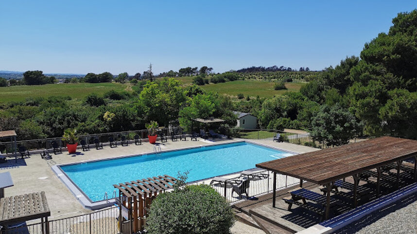 On-site facilities include an outdoor swimming pool, which is open from may and has plenty of sun loungers dotted around the pool to relax on and soak up the summer sun. The bar and reception area has a large outdoor terrace and has great views of the surrounding area and offers a variety of meals, including a charcuterie board and light snacks at lunchtime and a full menu is offered in the evenings. Musical entertainment is scheduled regularly here in the evenings during the summer too. There is a free weekly historical tour of the local village, which is very detailed and translated into many languages by an enthusiastic, passionate guide in exchange for a voluntary donation at a small museum of mainly ceramic and glass shards etc, from bygone civilisations. There is an Intermarche, a 5-minute drive from the campsite, and you can cycle to the Canal du Midi (about 10\15 mins), where you can then cycle along the Canal's pathway to Carcassone.