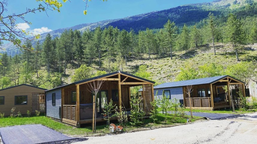 Camping La Ferme de Castellane is nestled in the mountains Provence-Alpes-Côte-d’Azur between pine forests and along a shallow river, a few km from the attractive town of Castellane. The site is also ideally located for visiting the Gorges du Verdon. The site has 67 grass pitches of which 24 are for touring units and have a 10/6-amp hook-up point. There are also 43 mobile homes, chalets or safari tents available for hire. The pitches are on grass and vary in size but are generally large enough for all your camping equipment. Most pitches have ample shade provided by mature trees.