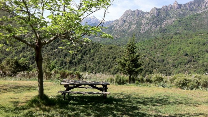Just as spectacular as the coastline is Corsica’s mountainous interior and by getting off the N200 this exceptional little campsite can be discovered. In a clearing among the trees are 25 pitches, many with electrical connection (20A). Whilst the panoramic view, peace and tranquillity are cause enough to be here, the enthusiastic couple, Mathieu and Angele who run the site have already made it noteworthy. They offer visitors a restaurant service with cuisine of Corsica, prepared from their own farm produce – Mathieu works on the farm, as well as being the chef.