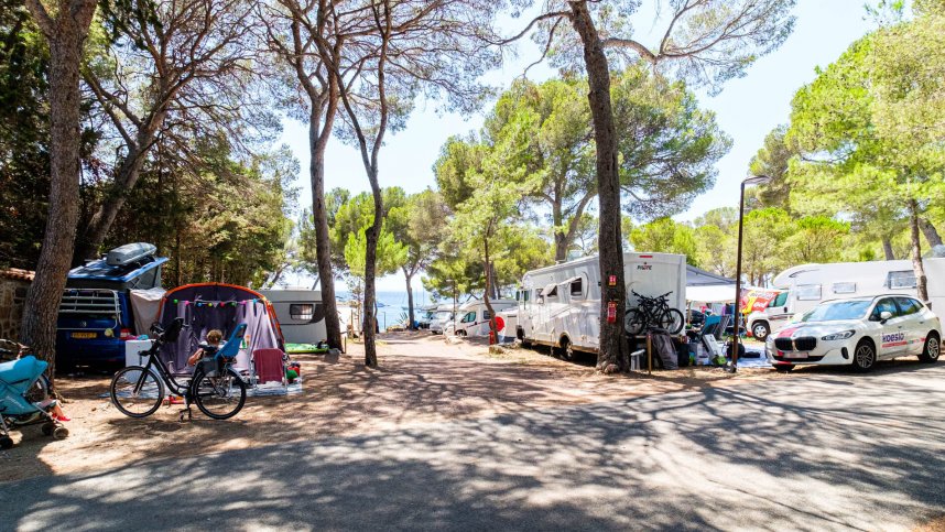 This site is now part of the Yelloh Village group, and standards on their sites are consistently high - Camping La Plage du Dramont is no exception. Check-in was efficient, and English was spoken; there is a large waiting area, and once you pass through the initial barrier, you will then be given directions to your pitch. There are 113 touring pitches, which have electric hook-up points available. These are generally open plan, under tree shade, but very dry and dusty due to the Mediterranean climate.