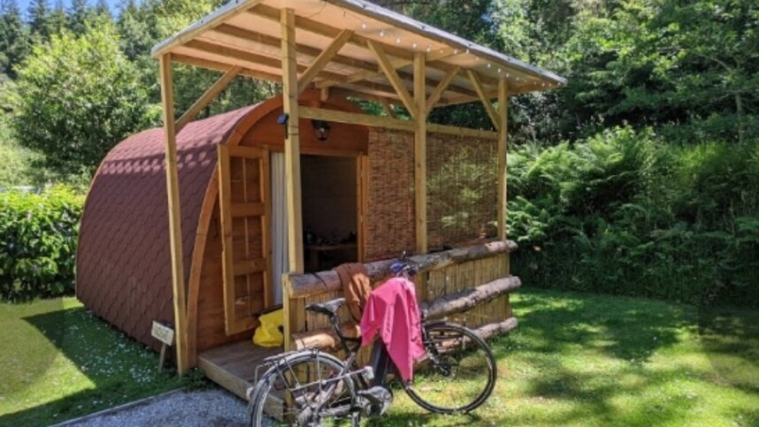 The recently renovated spacious, unisex sanitary block is equipped with hot showers, private washing cubicles, toilets, an accessible family bathroom, washing-up sinks and coin operated washing machine and dryer. There is an information room with local tourist leaflets, a book exchange, 2 fridge freezers and a microwave for the use of campers. A games room above the block has table tennis, board games, young children’s toys and a library. There is a small fenced-off play area for young children. Bicycle hire is available on site and kayaks etc. can be hired in nearby Chateaulin. A small shop at reception sells essential supplies, as well as fresh garden produce in season and eggs from the site's free-range chickens. 4 Glamping Pods are also available for rent.