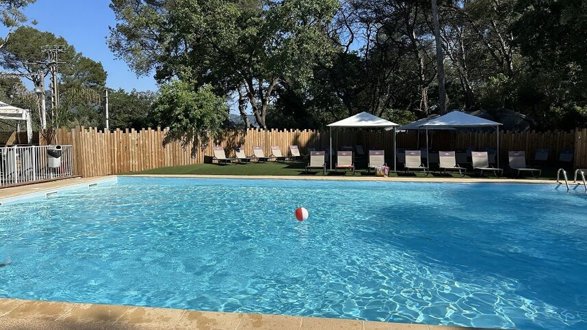 Le Beau Vezé is a quiet five-hectare site inland from the busy resort of Hyères. The owner tries to keep it as a family site with its quiet position, and it is a lovely site set on a wooded hillside. The first thing to consider is driving or walking up the hill to reach the pitches. There are 116 pitches, all with EHU, and a further 42 static units to rent. The pitches do offer a reasonable degree of shade and are generous. There is a restaurant and bar in an exceptional setting by the pool, which provides snacks, main meals, and even Tapas after 6.00p.m. The pool is a lovely place to relax, and there is a water slide and two smaller pools to enjoy, perfect for soaking up the Sun.