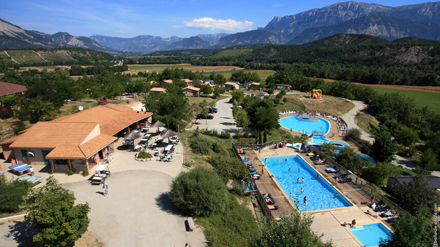 Le Couriou is a family run site in the beautiful Drôme countryside just south of Die. There are 131 stony/grassy, level pitches of varying sizes with 101 for touring (10A electricity). They are laid out on high terraces with superb views over the surrounding wooded hills; not ideal for those with walking difficulties. The pitches are separated by some shrubs and a variety of trees giving some shade. Though the site roads can be quite steep, access is not difficult for large outfits. It has a large pool complex, terraced bar and restaurant (all open to the public) with views across to the Vercors mountains.