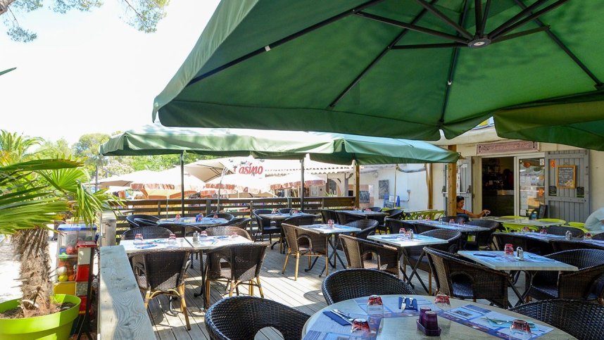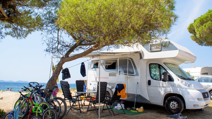 From N98, exit onto the D559 (La Londe). Follow signs for Les Ports, Les Plages. At roundabout, take first exit signed Plage, Port Miramar. Site entrance is signed on right in 600 m.