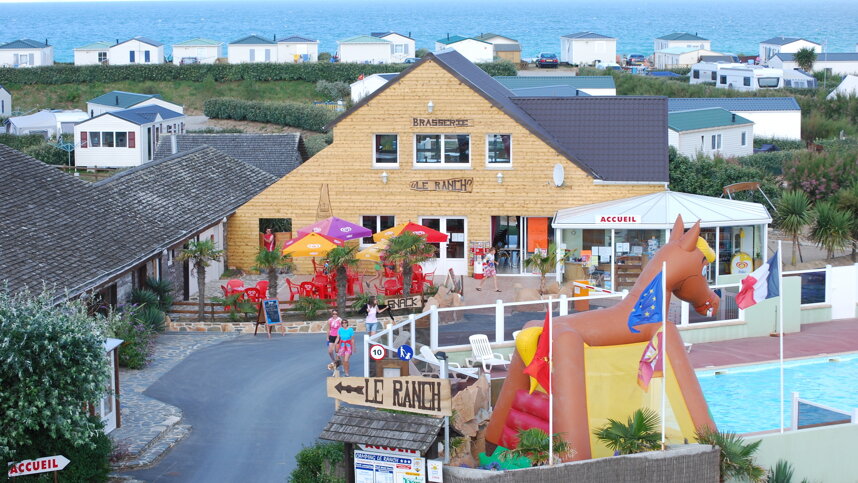 Le Ranch offers nature in the wild in an exceptional setting. Situated on the west coast of the Cotentin Le Ranch, in front of the Channel Islands, this family run site offers direct access to a long and wide sandy beach that extends to some 3 km. The site covers 4 hectares with 143 plots (30 fixed) and they all have 10A electricity, water and waste water. Booking is essential in high season. There is a pool complex with slides, an indoor and outdoor pool, and many areas for both children and adults to play. Here you will also find a bar-restaurant, a grocer's shop and bakery on site. Adults can enjoy the fitness room and sauna, and there is WiFi access all over the site.