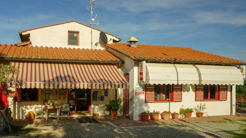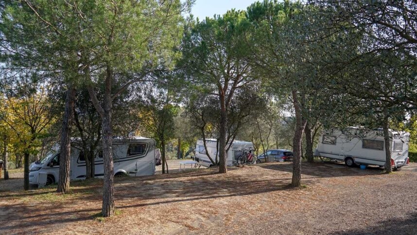 Le Soline is a country hillside site with wonderful views of the beautiful Tuscan landscape from its steep slopes and a very pleasant atmosphere. Just 20 km. south of Siena and 1 km. from the village of Casciano, it has neat, numbered terraced pitches for large units and tents, all with 6A electricity and Europlugs, water and wastewater. Olive trees provide some shade.