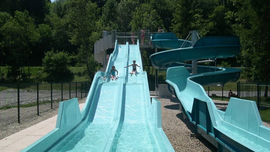 Overlooking a small fishing and boating lake and surrounded by wooded hills, this is an attractive, spacious site which is well maintained and excellent value for money. The site forms part of an outdoor leisure centre with lake swimming, water slides and a treetop adventure course, ideal for a young family. There are 230 marked grass pitches which are of a good size and slightly sloping. There are 213 for touring with 163 having electricity (6/10A) and 35 fully serviced. Some family activities, including a club for children, and are organised in summer. Although there a few facilities offered on site most are available with 1 km.