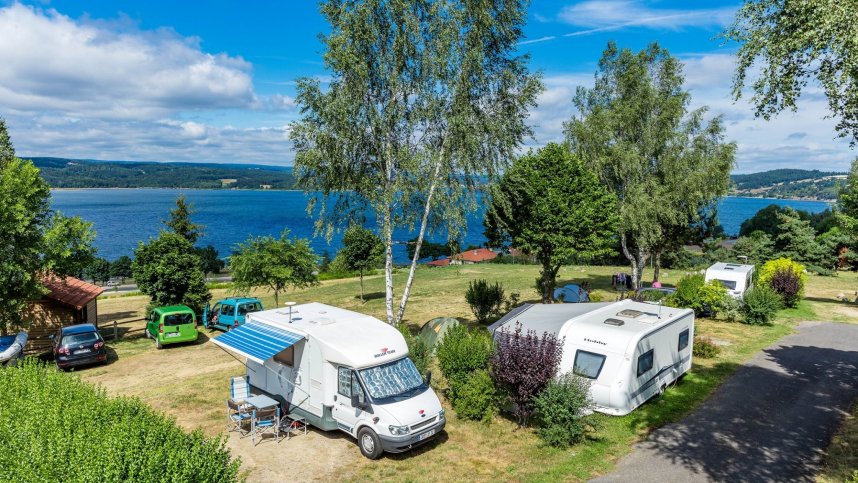 With friendly, family owners, this very spacious campsite and hotel complex is on the side of a steep hill at nearly 1,000 m. altitude (nights can be cold). There are 180 good sized, grassy pitches (some on a slight slope) often with part hardstanding (165 for touring). All have 6/10A electricity and many have panoramic views over the lake and surrounding hills. There are small trees on site offering a little shade. The lake offers a wide range of water based activities, notably sailing and fishing. The Lac de Naussac is the largest in the Lozère and this site has direct access to the lake.