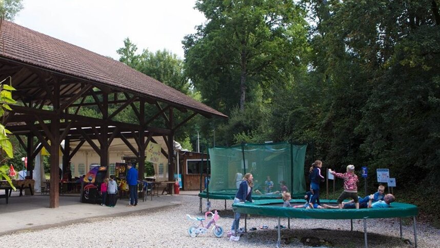Three sanitary blocks are supplemented by small units with WCs around the site. Well equipped showers. Special new block for children. Excellent accessible facilities. Laundry facilities. Shop, bar and restaurant (full menu in high season) and takeaway (1/6-1/9). Three swimming pools (all season). Tennis courts. Volleyball. TV and sports hall. Family evenings. Chalets and rooms to rent. Access to all three lakes 15 km. WiFi.
