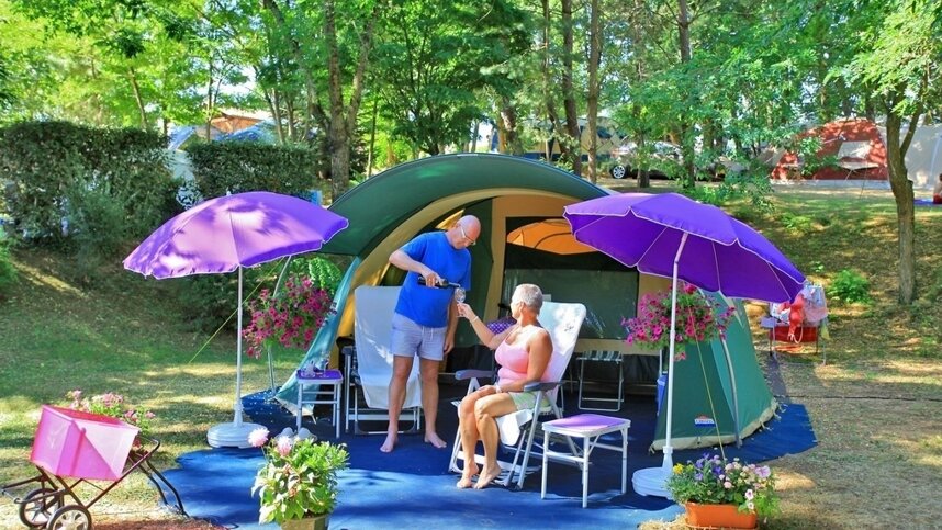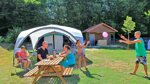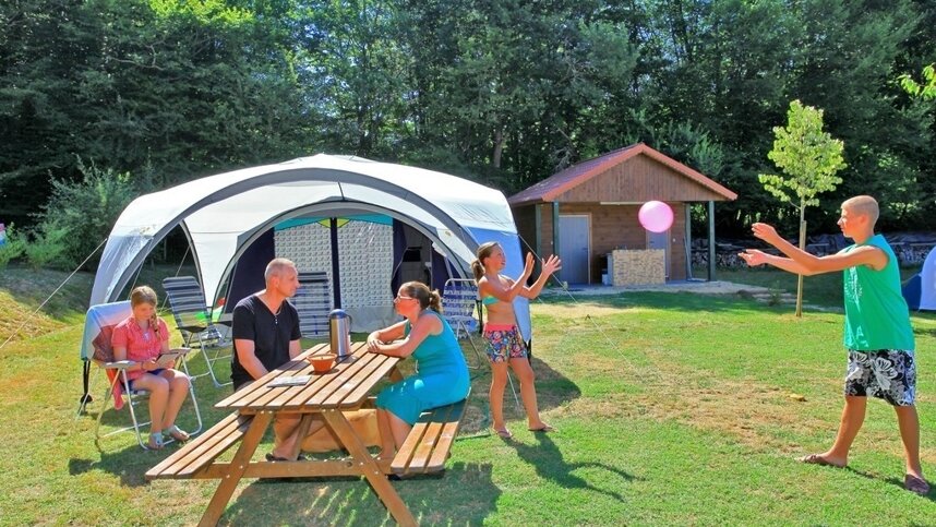Two clean modern toilet blocks, both with family shower rooms. Accessible facilities. Washing machine. Shop (1/6-30/9), bar and restaurant (1/6-30/9), takeaway (1/6-30/9) and a terrace overlooking the valley. Outdoor heated swimming pool with sun terrace and paddling pool (15/5-30/9). Play area near the lake and pool. Fishing. Canoeing. Free WiFi on part of site. Electric and charcoal barbecues are permitted.