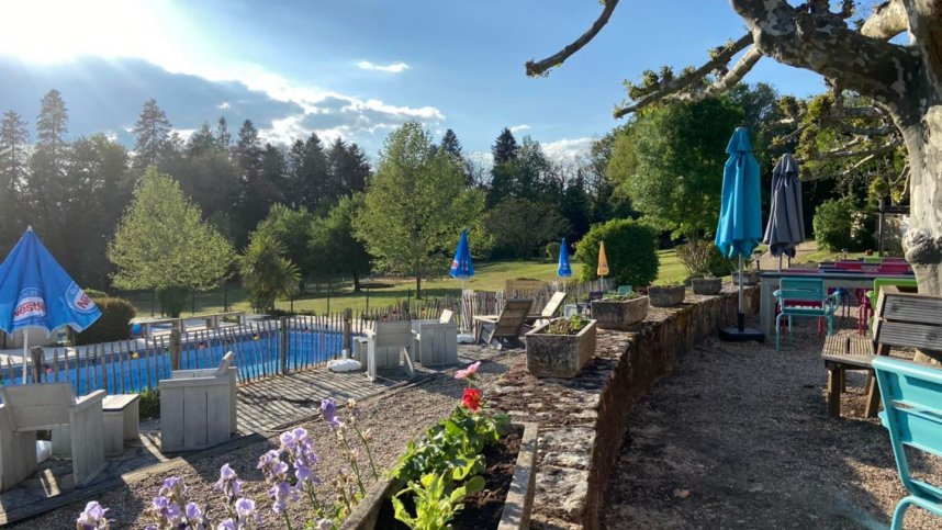 The site is just off the main N21 road near Pont Saint Mamet, mid-way between Bergerac and Périgueux. There are 104 large pitches, most are flat, shaded and wooded, some on more sloping open meadow with views across the valley and others on flat ground beside the lake. Pitches are marked and all have electricity (6/10A), some requiring long leads. The swimming pool and small lake with diving platform and beach encourage longer stays. A pleasant, shaded patio terrace under vines and maples leads to a general room with a bar and a separate room for young people with amusement machines (July/Aug).