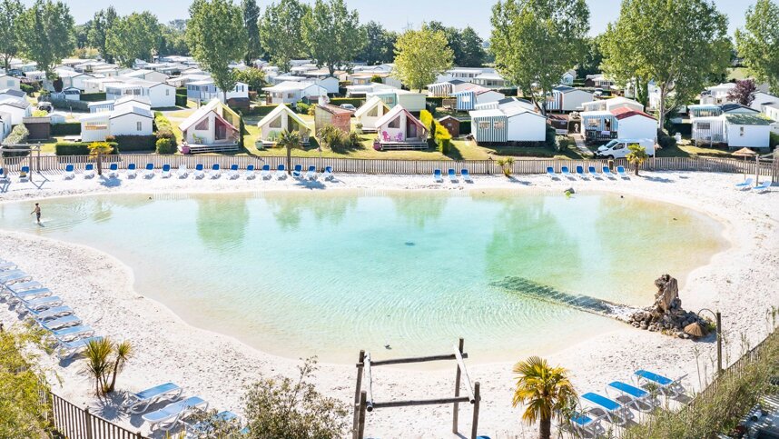 Camping l’Evasion is located close to the Lac de Jaunay, well known for its water-based activities. This modern, well-equipped site boasts a natural swimming pool bordered by white sand. There is also a traditional outdoor swimming pool with slides, plus a large, covered pool with a Jacuzzi.