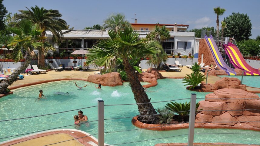 This is a comfortable site in an area where the residents of Montpellier escape for their summer weekends. The site is dominated by its impressive high level reception area, restaurant, bar and swimming pool, with access by lift for people with disabilities. Behind this, the site stretches to the river which lies hidden behind a high bank and gated fence. The site is green and shady with 250 sandy grass pitches (Europlug, long leads required) with 100 for touring units mixed amongst mobile homes and chalets to let. The site seems surprisingly tranquil considering the dual-carriageway to Palavas runs past the front.