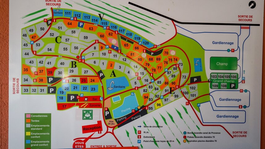 Two good sanitary blocks provide ample WCs, washbasins and showers. Accessible facilities, Laundry facilities. Shop (fresh bread daily). Bar with terrace, snack bar and takeaway(1/5-30/9). Swimming pool (15/5-15/9). Play area. Tennis court, Table tennis, Multi sports pitch, Library. WiFi in the bar area.