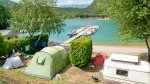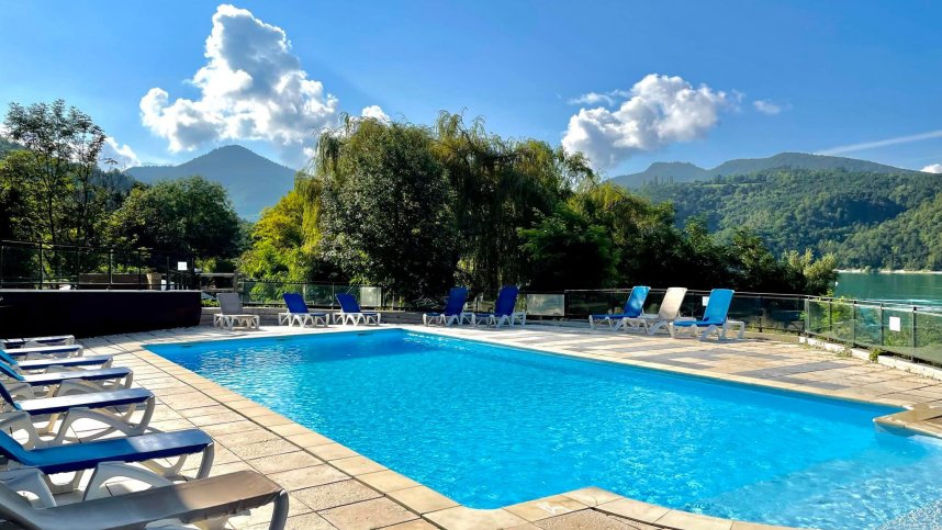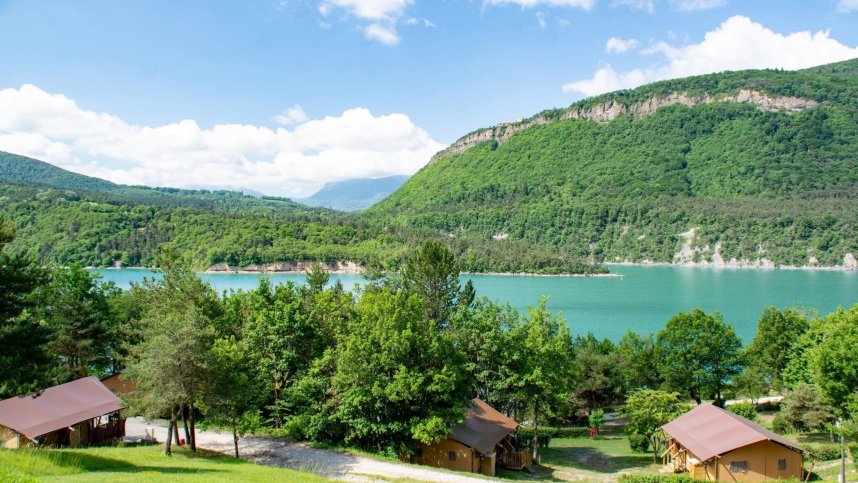Camping de Savel is the site for you if you are a lover of hiking, water sports and family-friendly holidays. It is ideally located in Mayres-Savel, Isèr, in the heart of the Alps, at the crossroads of three natural parks (the Vercors, the Chartreuse and the Ecrins National Park) and 45 minutes from Grenoble; the site stretches along Lake Monteynard. Second windiest lake in Europe, the joys of windsurfing, kitesurfing or catamaran sailing are yours. After a busy day, you will be able to make full use of the heated swimming pool overlooking the lake and the mountains, gourmet restaurant with homemade dishes, and night entertainment on Thursdays and Saturdays (in July/August). For those interested in fishing, the site sells fishing licenses. One of the most beautiful hiking trails in Europe is 3 km from the site, La Passerelle du Drac, via a footbridge over the lake.