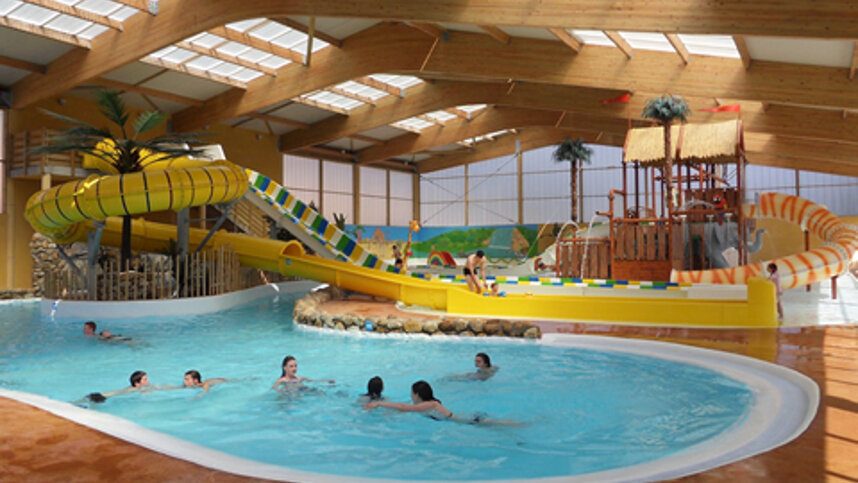 Three well appointed toilet blocks include accessible facilities. Covered laundry area. Shop. Bar (July/Aug). Large, indoor aquatic park with slides flumes and fountains. Outdoor pool with slides (1/6-2/9; heated July/Aug) and paddling pool. Games room. TV room. All-weather sports pitch. Tennis. Minigolf. Three play areas. Two fishing lakes. Children’s zoo. Some entertainment in high season. No electric barbecues. Mobile homes, chalets and tents to rent.