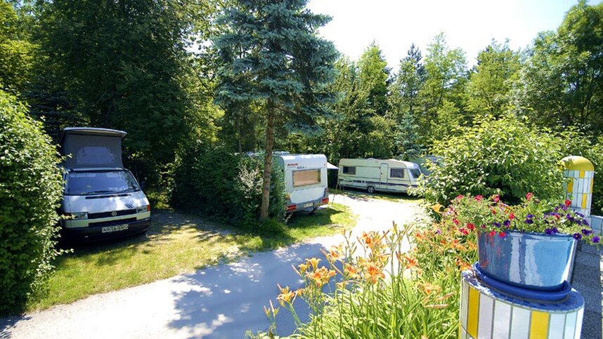 A small site in the town suburbs, Nord-Sam is very close to the A1 Salzburg-Nord autobahn exit 288, and so makes a convenient stopover. It is also acceptable for a longer stay, being on the edge of the town and with its own small fenced swimming pool. It is divided into 100 individual pitches (with 10A electricity), which are not very large and are separated by tall hedges, etc. which offer some privacy and are also attractive to wildlife (including red squirrels). Pitches are quite well shaded and the site is well tended, with flowers and shrubs. You should find space if you arrive reasonably early.The Western side of the site is close to a railway.