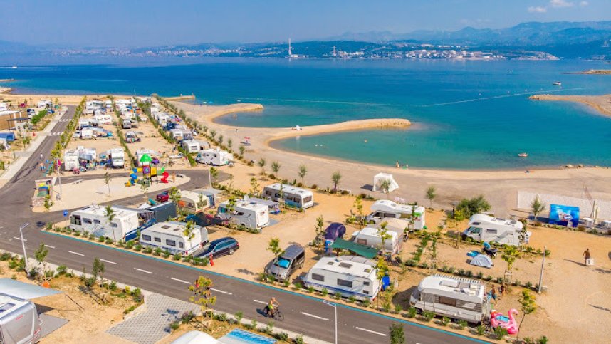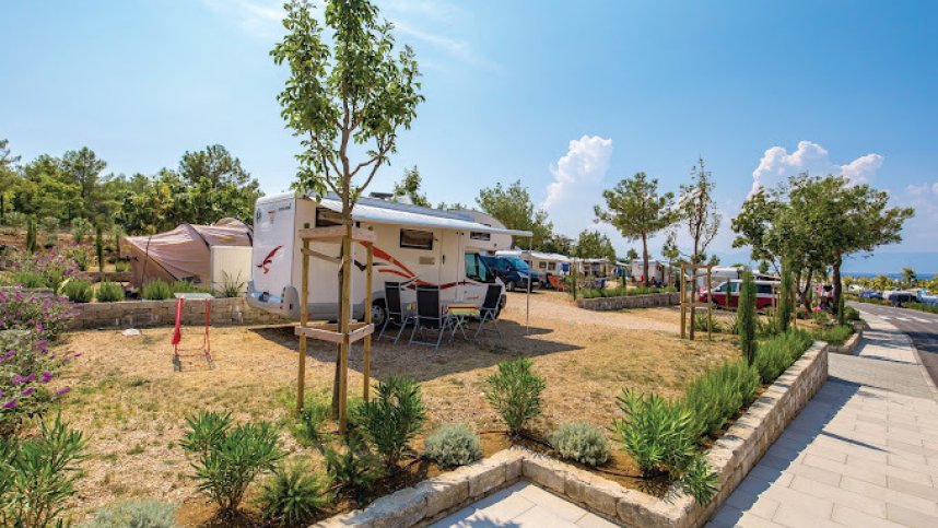 Camping Omisalj is situated on the island of Krk in Croatia, right on the Adriatic Sea. The campsite is fairly new and underwent renovations, offering modern amenities and facilities for an enjoyable camping experience. On-site, you will find 230 pitches, 120 of which are for touring and have electric hook-up points available. The campsite maintains a clean and organised layout, with young plants and flowers separating the pitches. While there's not much shade yet due to the new plants still growing, this allows for a clear view of the beautiful Adriatic Sea from most locations.
