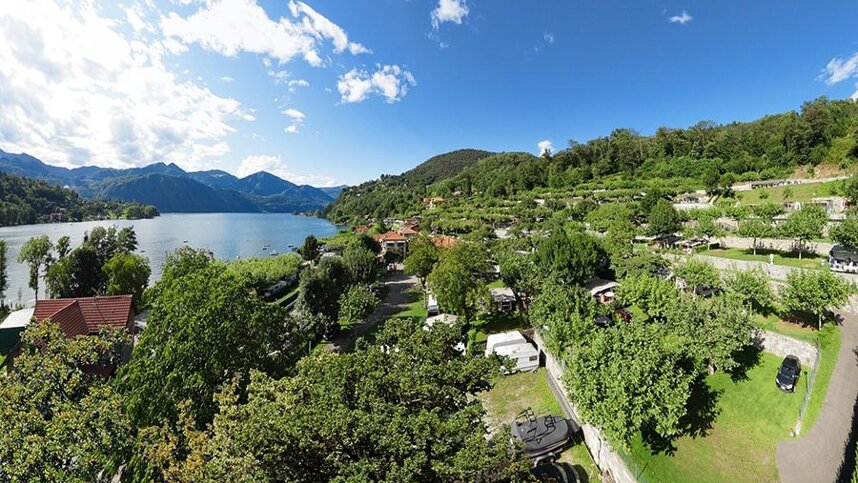 Lake Orta is 85 km. northwest of Milan, just west of Lake Maggiore. Site is on the SR229 between Borgomanero and Omega, 600 m. north of the turn to Orta San Giulio. Parking area for arrivals is on lake side of the road, with reception and main entrance on the opposite side.