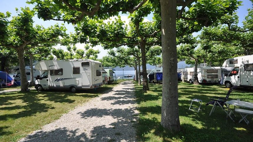 Lake Orta is a delightful, less-visited small lake just west of Lake Maggiore. The site is on a considerable slope and most of the 80 touring pitches (all with 6A electricity) are on the top grass terrace with spectacular views across the lake to the mountains beyond. There are some superb lakeside pitches across the main road (linked by a pedestrian underpass) although there is some traffic noise here.