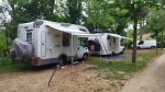 Four toilet blocks. Washing machines. Motorhome services. Swimming and paddling pools. Bar, pizzeria and shop (all season). TV room. Games room. Play area. Sports court. No gas or electric barbecues. WiFi over part of site.