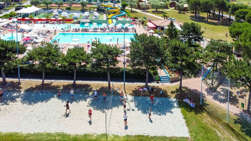 Five very clean, modern sanitary blocks have hot water throughout and British style toilets, some in cabins with washbasins. Private bathrooms for hire. Good baby rooms. Accessible Facilities. Washing machines. Motorhome services. Fridge hire. Bar/restaurant, takeaway and pool bar serving snacks. Shops. New swimming pool with flumes (mid April-Sept). Tennis. Archery. Minigolf. Play area and miniclub. Fishing (with permit). Beach at site. Watersports. Kayaking. Windsurfing. Daily medical services. Entertainment programme in high season. Excursions. Dogs and motorbikes are not accepted. Torches useful. WiFi on part of site (charged).