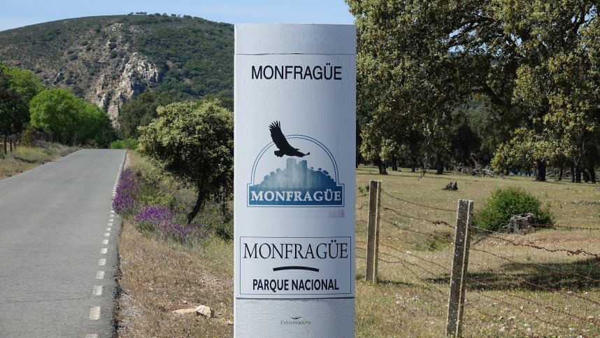 From A66 take exit 470 onto the A1 toward Navalmoral de la Mata. From the A1 take exit 46 toward Trujillo following signs to Parque Natural de Monfrague. Site is on left after viaduct. Where this road enters the main Parque area (to the south), it does become narrow, and it may be advisable to avoid traveling its length to Trujillo with a motorhome or towed caravan.