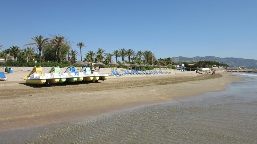 Alcoceber (or Alcossebre) is between Peñiscola and Oropesa. Turn off N340 at 1018 km. marker towards Alcossebre on CV142. Just before entering town turn right immediately after two sets of traffic lights. Follow road to the coast and site is 2.5 km. Avoid alternative route given by GPS (narrow and uneven in places).