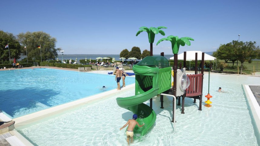 Beside the lake, Polvese takes its name from the island which can be seen clearly from the site. The 70 touring pitches (6/9A electricity) are in one corner, but the site is primarily for the 250 very permanent pitches rented by Italian and German guests. We see this as a site for short visits rather than extended stays. On flat ground, the pitches are reasonably sized, and some are by the lake. Mature trees provide good shade. There are two pools, one is for children, but it is deep. The restaurant is close to the gate, as is the entertainment area.
