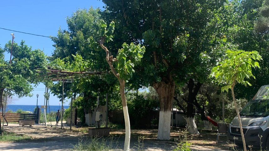 An outdoor swimming pool and a traditional taverna serve local dishes and traditional Greek cuisine. The renovations, however, have been at the expense of access to the campsite, which is 40 meters lower down the hill at beach level. There are 53 pitches for touring units, set amongst olive and pine trees. Using the site’s internal road for vehicles is now almost impossible, so having stopped at reception, you continue down the hill to a second entrance.