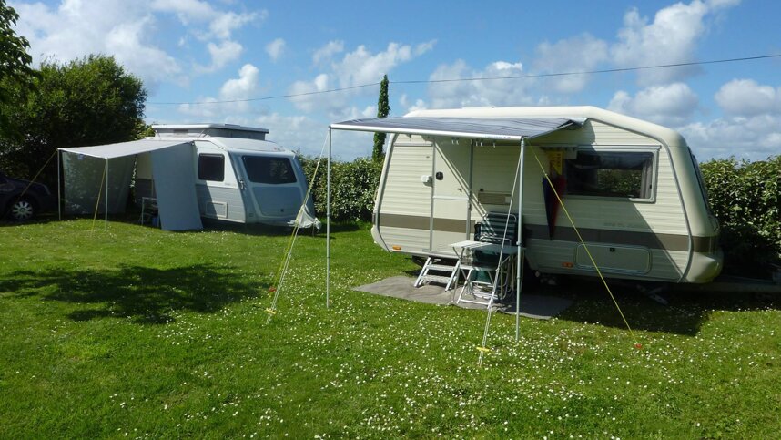 This small site situated on the Cap Sizun peninsula is lovingly cared for by English owners Graham and Nikki Hatch. The site is hilly but the terrain has been terraced to provide 98 fairly level pitches. Many mature trees and shrubs provide some shade and areas of privacy. Long leads are required for the 60 electric hook-ups (10A). The owners have recently purchased new, wooden mobile homes to blend in with the rural ambiance of their campsite. These are all equipped with televisions which receive English and French channels. A 200 m. walk takes you to a delightful sandy bay and you can also access a coastal path.